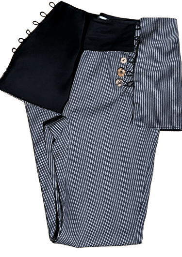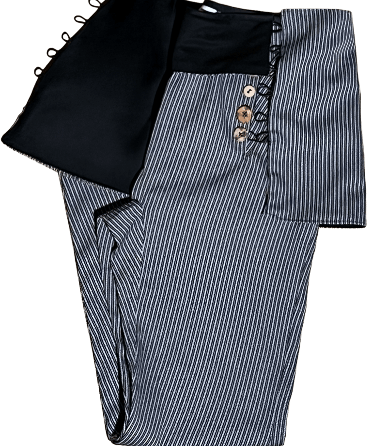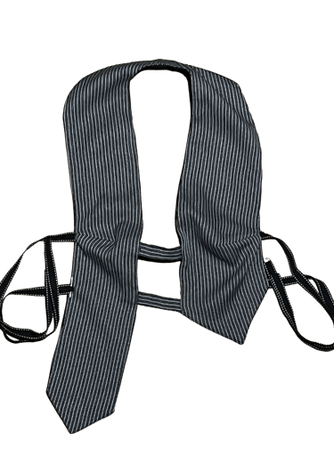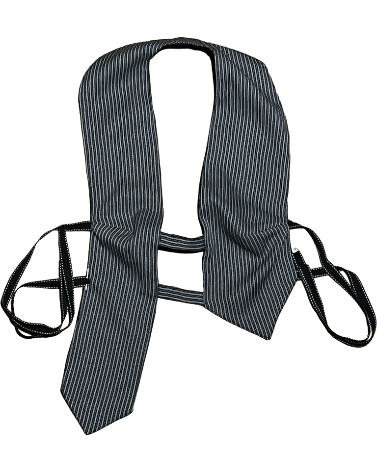 El top Dada nace desde esta idea. Su nombre hace referencia al movimiento dadaísta, y su diseño rompe con lo convencional a través de una silueta inesperada, una corbata sobredimensionada que cuestiona las normas establecidas. Es una pieza con carácter, ligeramente irreverente y con una fuerte carga artística. Además, es reversible: negro con rayas o blanco con marrón.